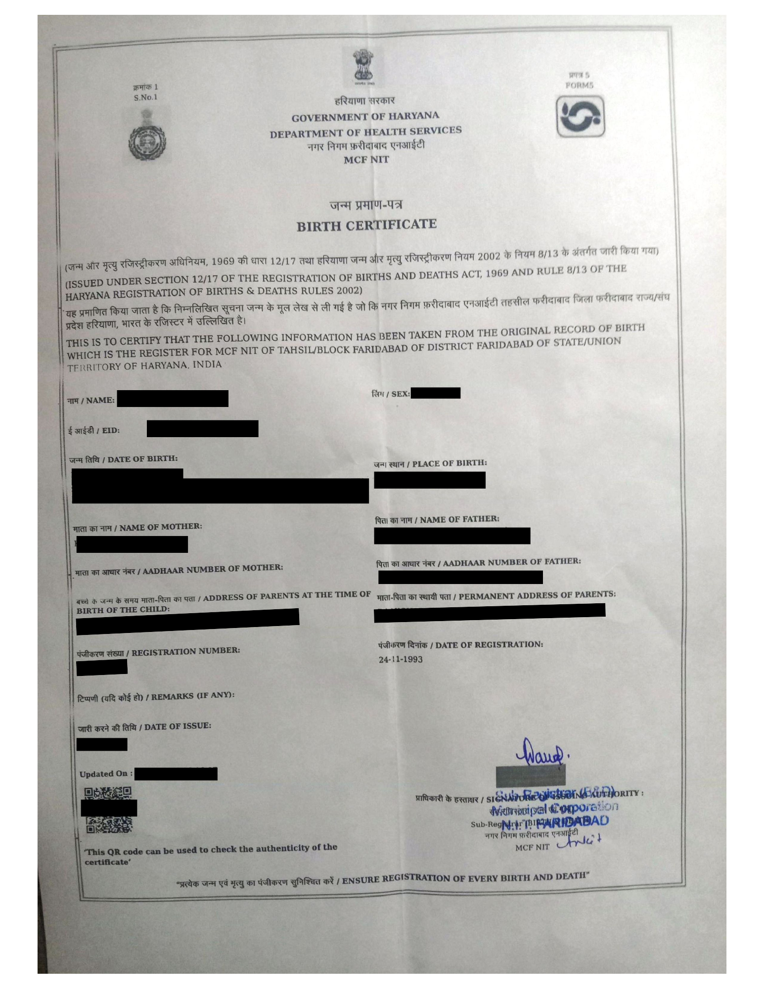 Birth Certificate from Faridabad