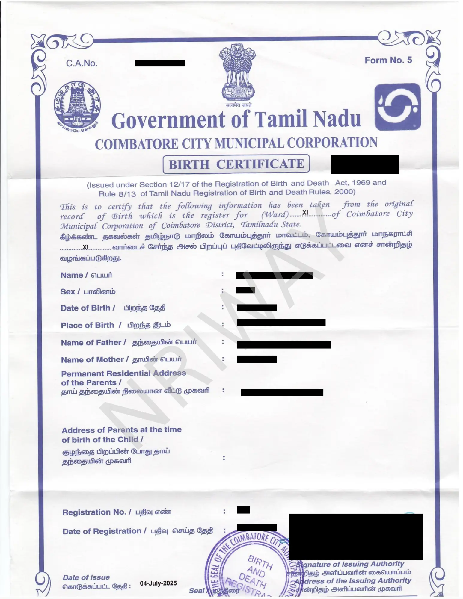NRIWAY applies for a birth record search at the Municipal Corporation. If the record is found, a Birth Certificate (Form 5) is issued. If no record is available, a Non-Availability of Birth Certificate (NABC - Form 10) is issued. The certificate is signed by the Sub-Registrar of Birth & Death or the Health Department.