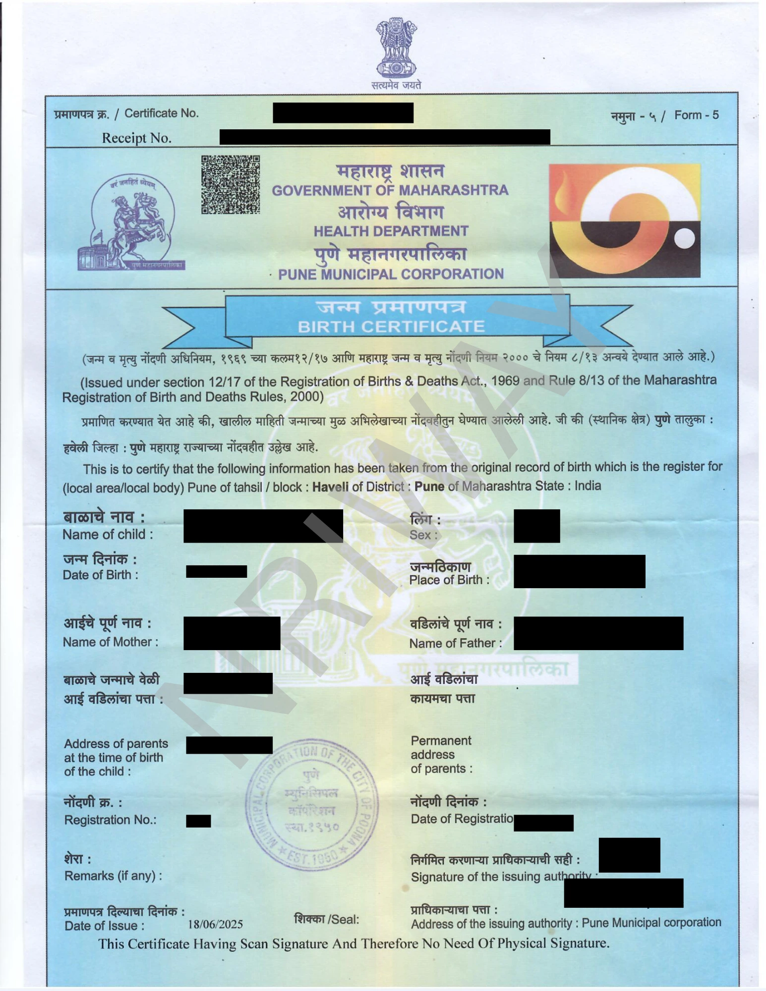 A Birth Certificate is an official record of birth registered with the local municipal authority. In Pune, birth registrations are maintained by the municipal authorities under the Registration of Births and Deaths Act, 1969.