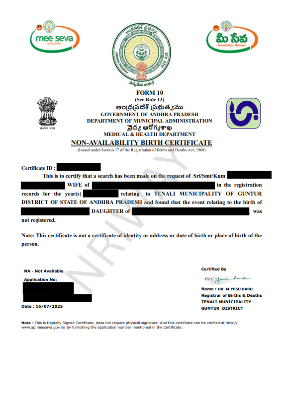 NRIWAY applies for a birth record search at the Municipal Corporation. If the record is found, a Birth Certificate (Form 5) is issued. If no record is available, a Non-Availability of Birth Certificate (NABC - Form 10) is issued. The certificate is signed by the Sub-Registrar of Birth & Death or the Health Department.
