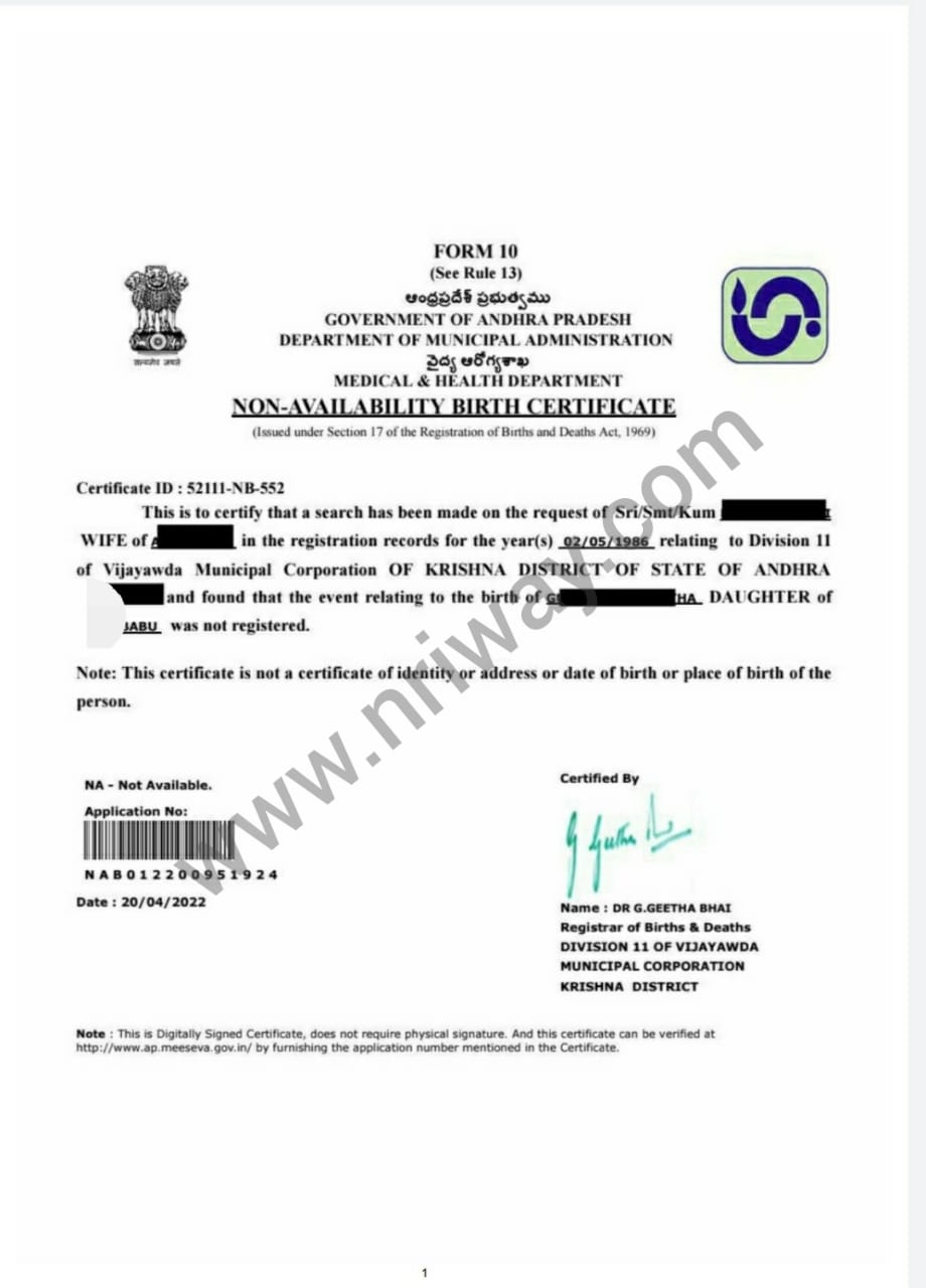 NRIWAY applies for a birth record search at the Municipal Corporation. If the record is found, a Birth Certificate (Form 5) is issued. If no record is available, a Non-Availability of Birth Certificate (NABC - Form 10) is issued. The certificate is signed by the Sub-Registrar of Birth & Death or the Health Department.